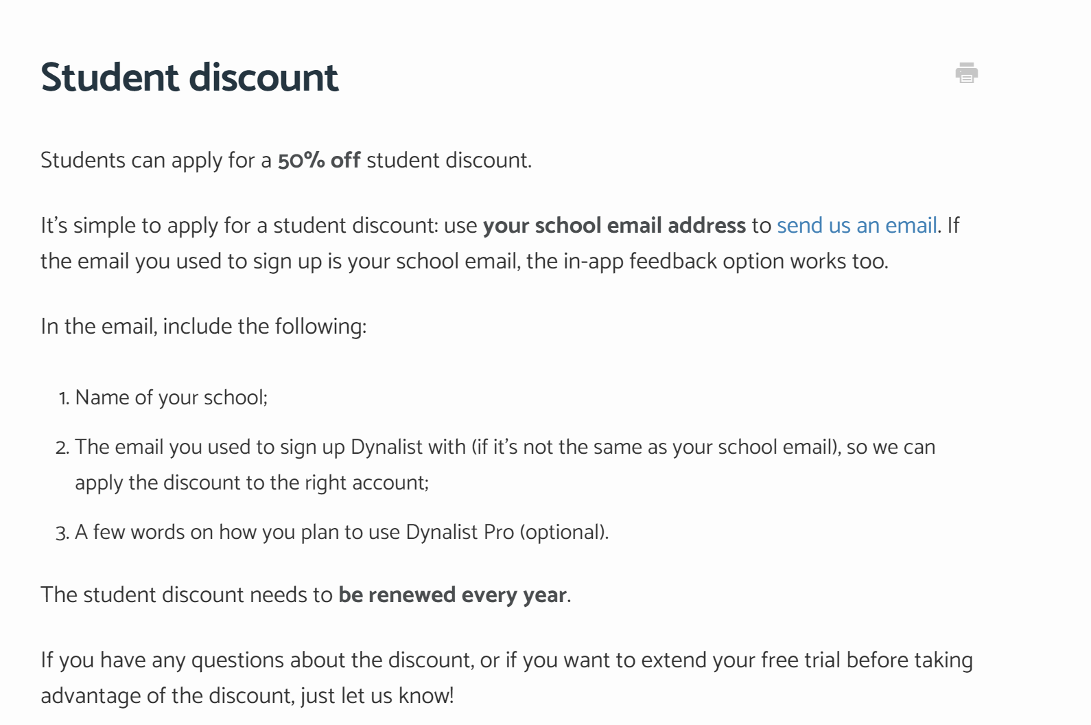 2. The email you used to sign up Dynalist with (if it's not the same as your school email), so we can apply the discount to the right account;