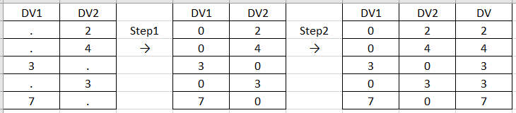 아래는 서로 다른 DV1 DV2 두 변수의 결측 값을 0으로 만드는 코드입니다.
