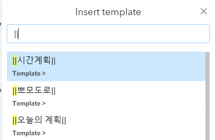 이제 템플릿을 사용하고 싶은 문서로 가서 템플릿을 검색하면 됩니다.