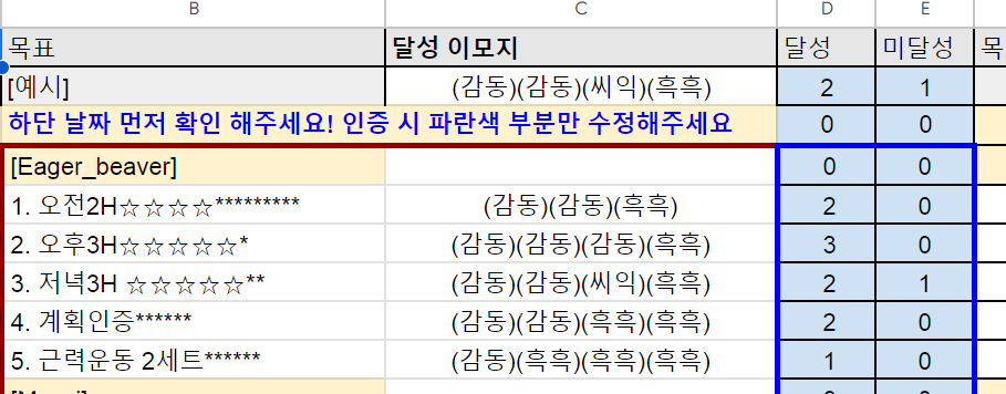 - 목표 달성 성공 시 "달성 부분" 숫자를 하나 올려주세요 (+1)