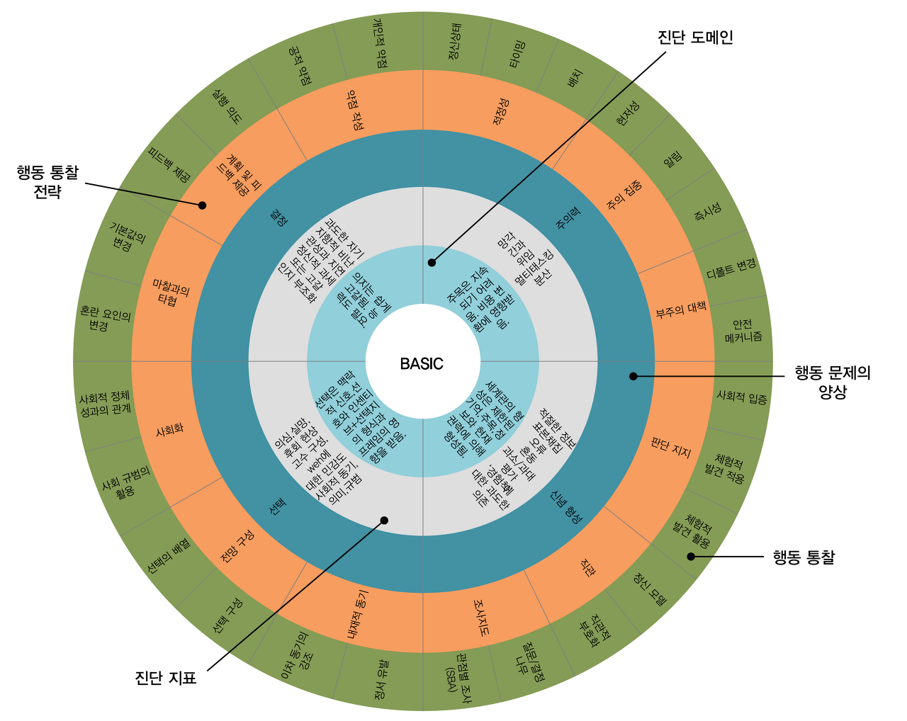 - 사람의 행위 속성에 대한 통찰력을 가지고 행동을 지배하는 요소들에 대한 적절한 개입 → 행동 변화 우도