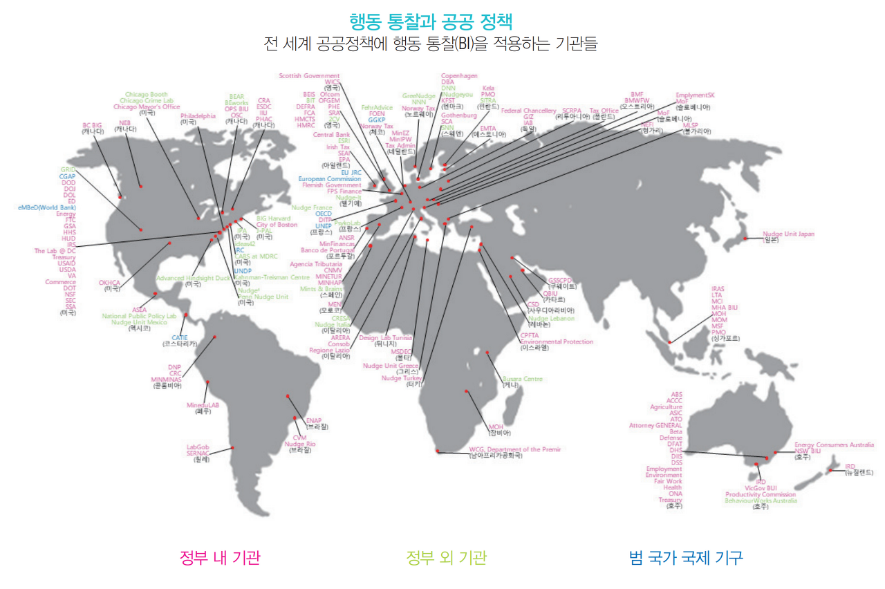 전 세계 정부 내외에 관련 기관에서 공공정책에 BI를 적용을 시도한 사례들이 200건이 넘으며, OECD와 같은 정부를 지원하는 다국가 협의체에서도 이러한 시도 가 있었으며, 수많은 사례들이 BI가 일시적 유행을 넘어 정책 개선을 위해 중요한 수단이 되고 있음을 말해주고 있다. (아래 그림 참조)