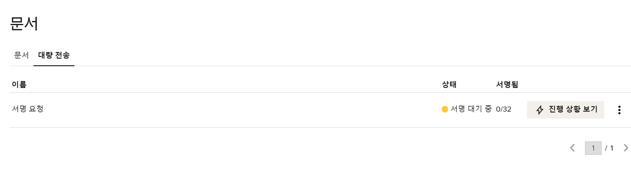 좌측 상단에 대량전송을 눌러보세요. 다만 미리 서명받고자 하는 문서의 템플릿 추가를 해두어야 합니다!