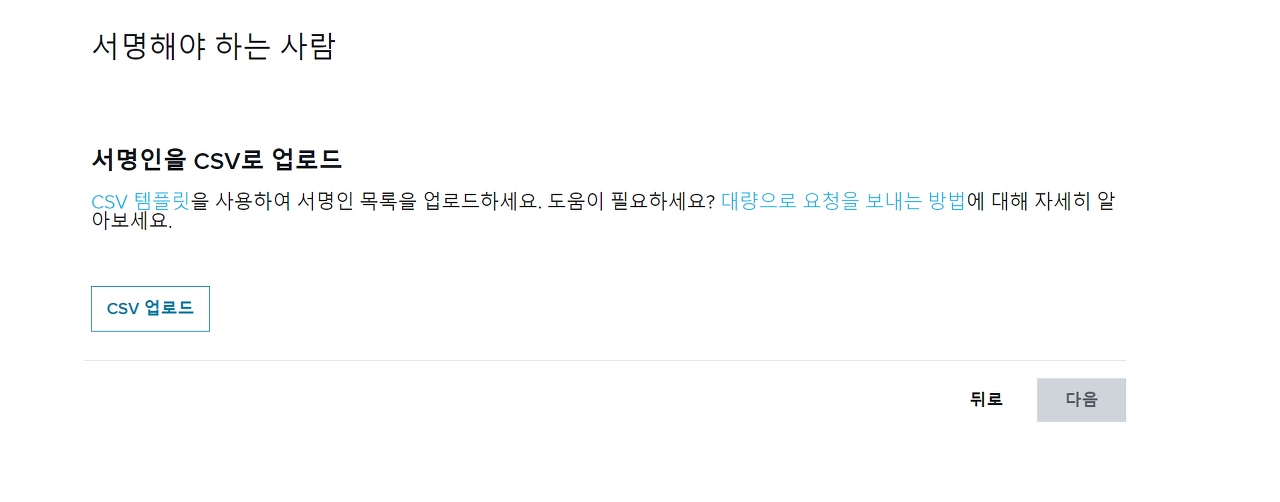 이후에 서명인을 CSV로 업로드하라고 뜨네요. CSV 템플릿을 눌러 양식에 맞게 만든 뒤 업로드해줍니다.