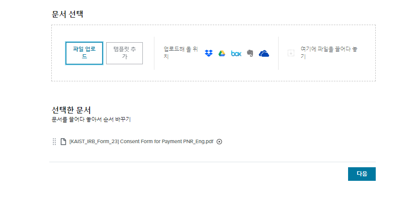 문서 탭을 눌러서 서명 요청을 눌렀습니다. 이후에 서명을 원하는 파일을 업로드해주세요. pdf파일로 만들어 두셔야 올라갑니다! 여기서 이미 템플릿을 만들어 둔 경우는 앞서 만든 템플릿을 끌고 오면 됩니다. 다만, 이는 유료 기능입니다! 뒤에서 설명드릴게요.
