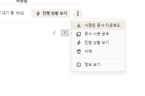 대량 전송의 경우 한 번에 pdf 파일을 받을 수 있는 장점이 있습니다. 우측 점 3개를 누르면 서명된 문서 다운로드가 있습니다. 이를 누르시면 메일로 다운로드 링크가 전송됩니다.
