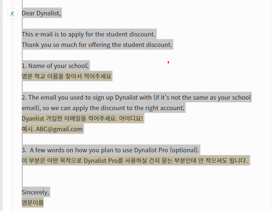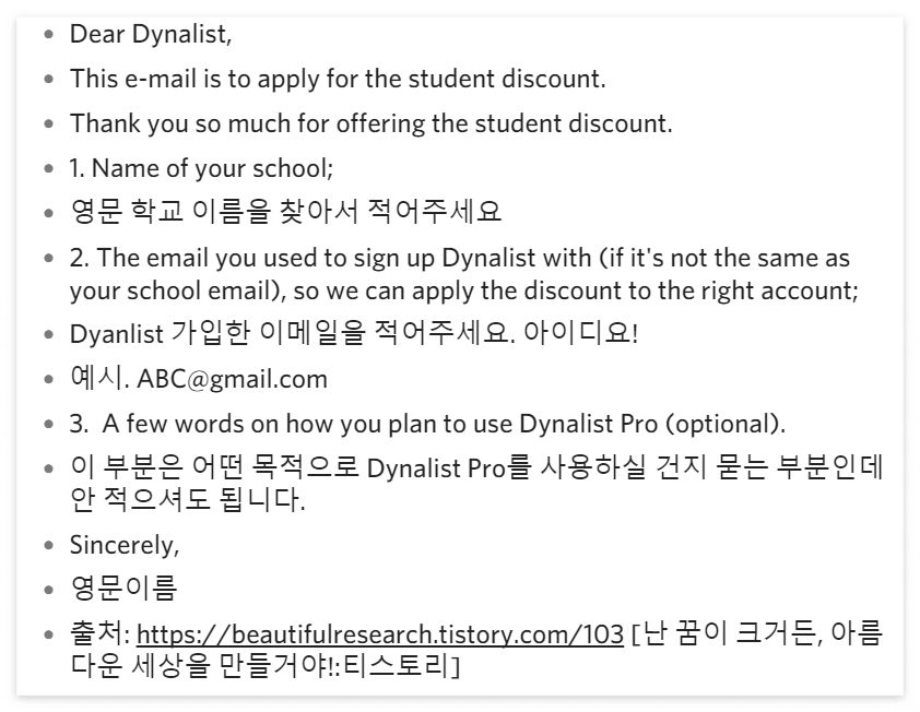 제 블로그의 다이널리스 학생 할인 방법을 적어놓은 글에서 샘플 이메일을 한번 복사하고 다이널리스트에 붙여 넣어 볼게요!