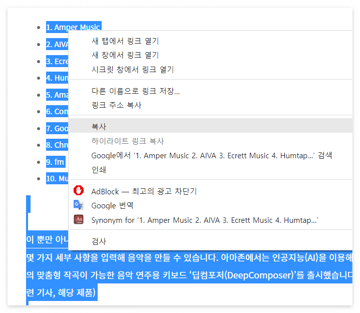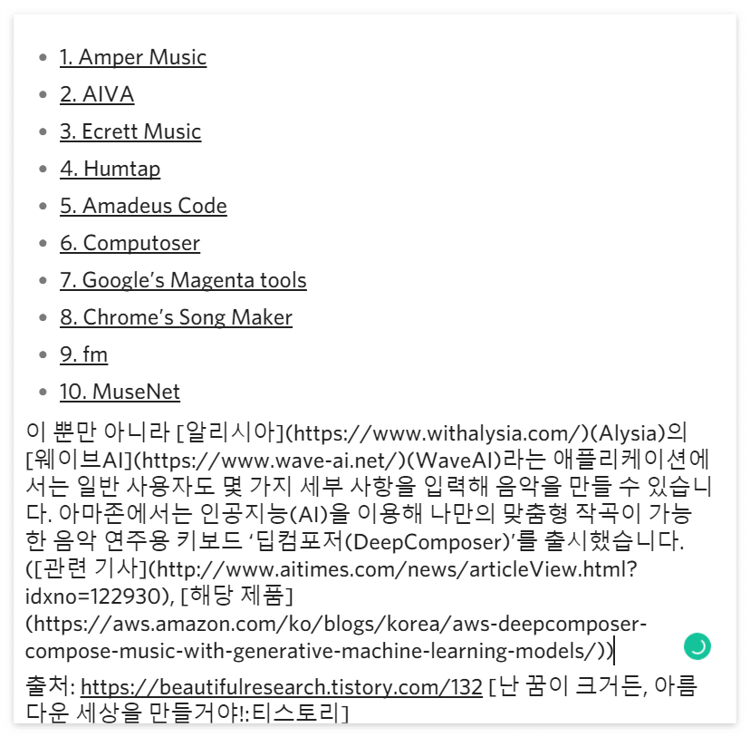 다음에는 제 블로그의 "인공지능이 작곡가를 대체할까?" 글의 내용을 붙여넣어볼게요