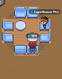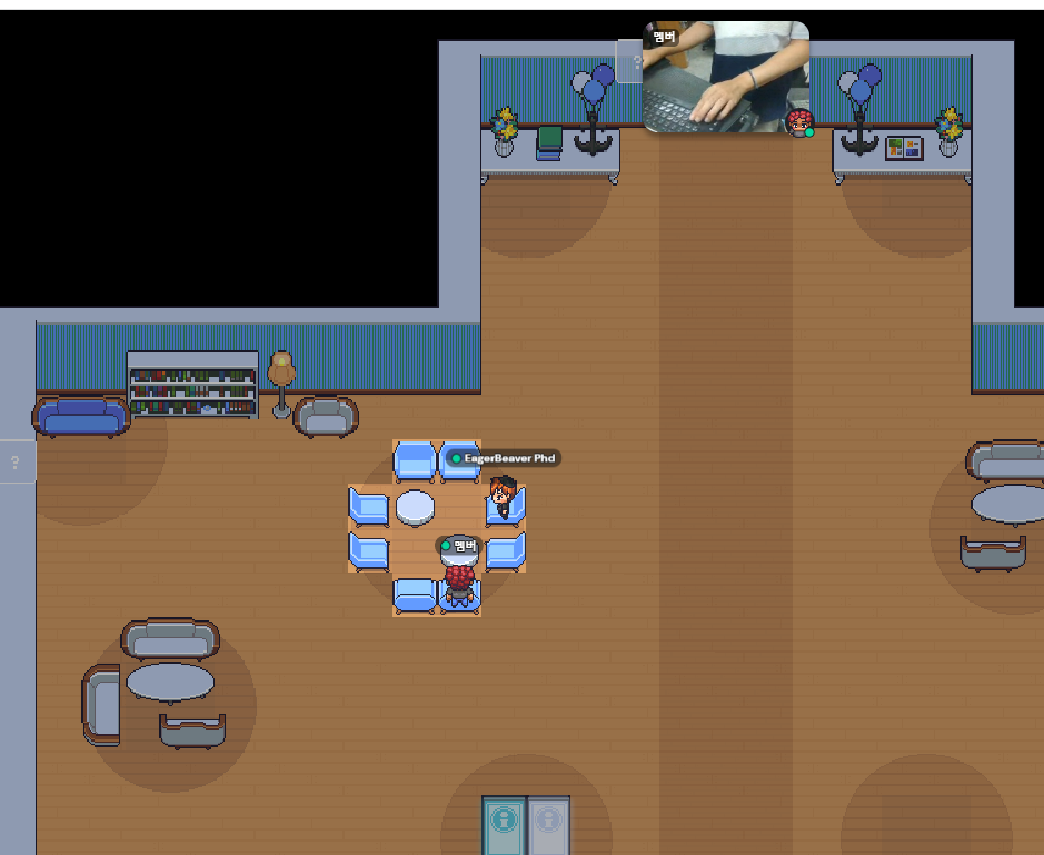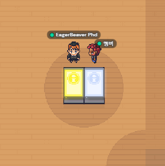 자 이렇게 두 캐릭터가 생겼어요. 이제 캐릭터들이 요렇게 한 공간에 모이면? 공간 안에 있는 사람들끼리 회의를 할 수 있습니다. 꼭 저기 공간이 아니더라도 서로 만나면 회의가 시작됩니다.