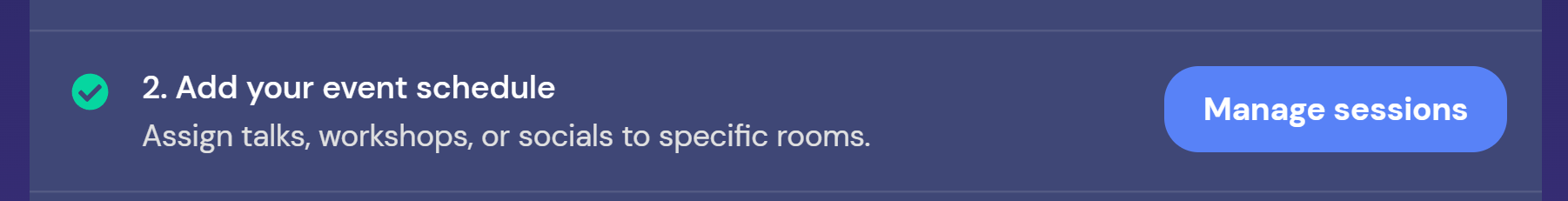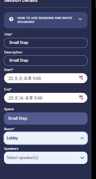 다음으로 이벤트 일정을 추가해볼게요! 아래 이미지의 Manage Sessions를 누르시고 정보들을 입력해보세요!