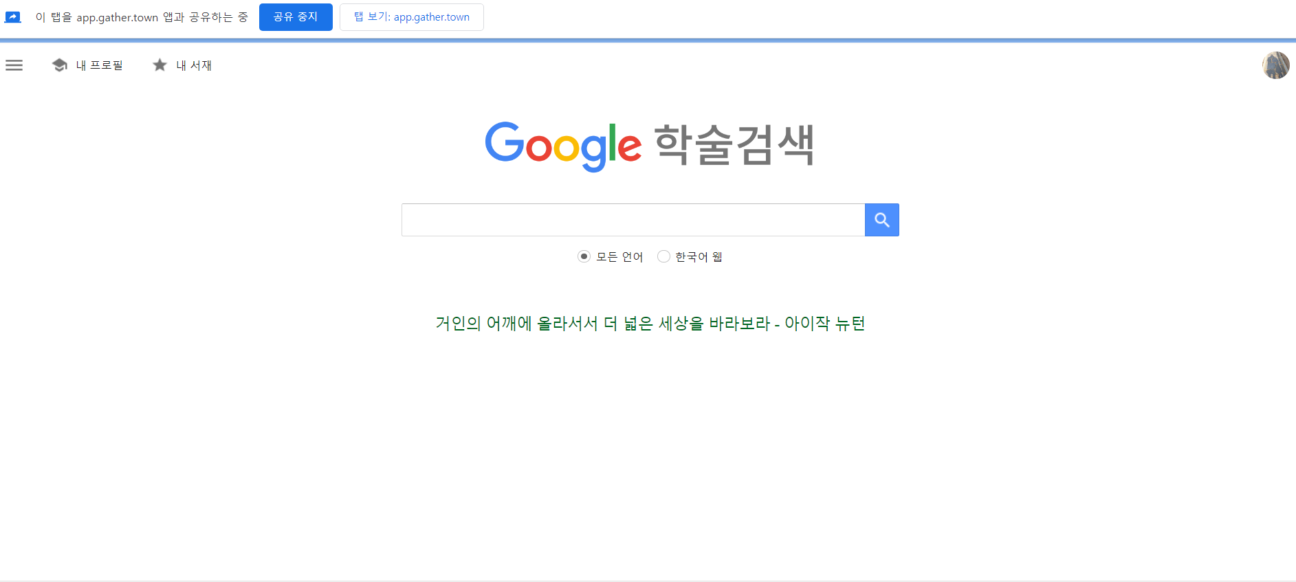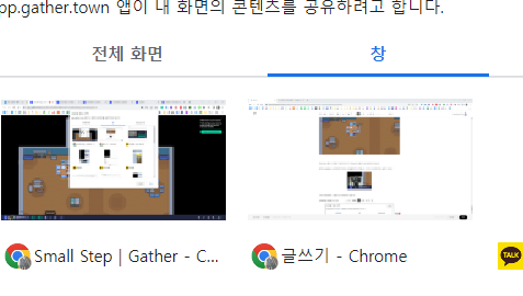 공유자가 상단에 탭 보기: app.gather.town을 누르면 또 요렇게 참가자들의 모습을 보면서 동시에 진행할 수도 있습니다.