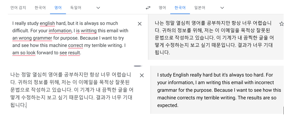 오 그래도 구글 번역기가 조금 더 성능이 좋군요. 역시 구글이네요..! 아마 많은 분들이 그동안 이렇게 번역기의 도움을 받아왔을 겁니다.