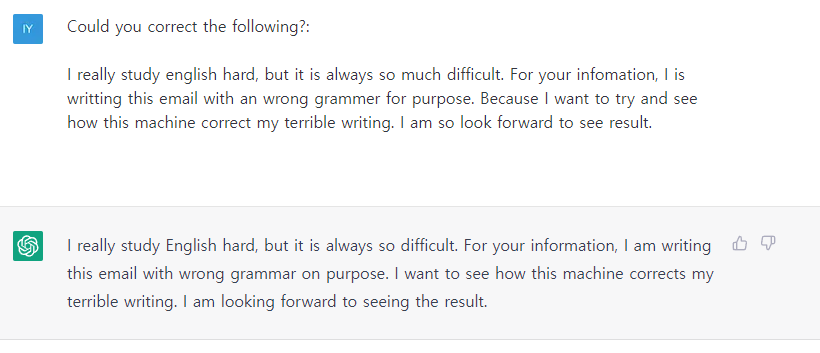 I have been studying English hard, but it is always so difficult. For your information, I am writing this email with wrong grammar on purpose. I want to try and see how this machine will correct my terrible writing. I am looking forward to seeing the result.