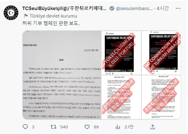 아무래도 무랏 타메르 주한 튀르키예 대사가 직접 말한 기부 방법이 제일 좋으리라 생각돼서 그 방법으로 진행해보려고 합니다.