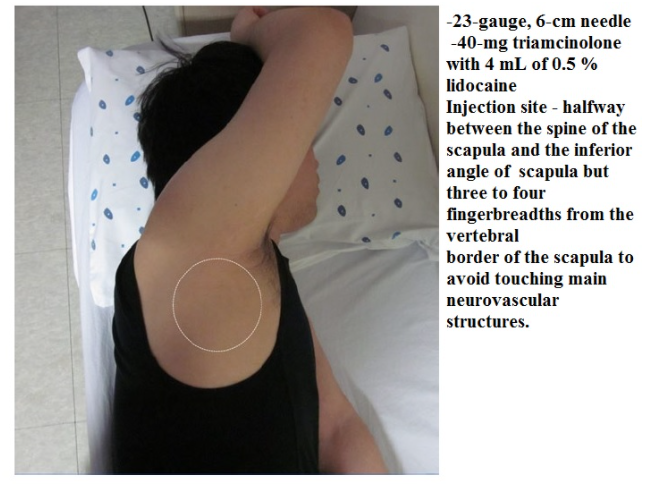 Lee, D. G., & Chang, M. C. (2018). Dorsal scapular nerve injury after trigger point injection into the rhomboid major muscle: A case report. Journal of back and musculoskeletal rehabilitation, 31(1), 211-214.