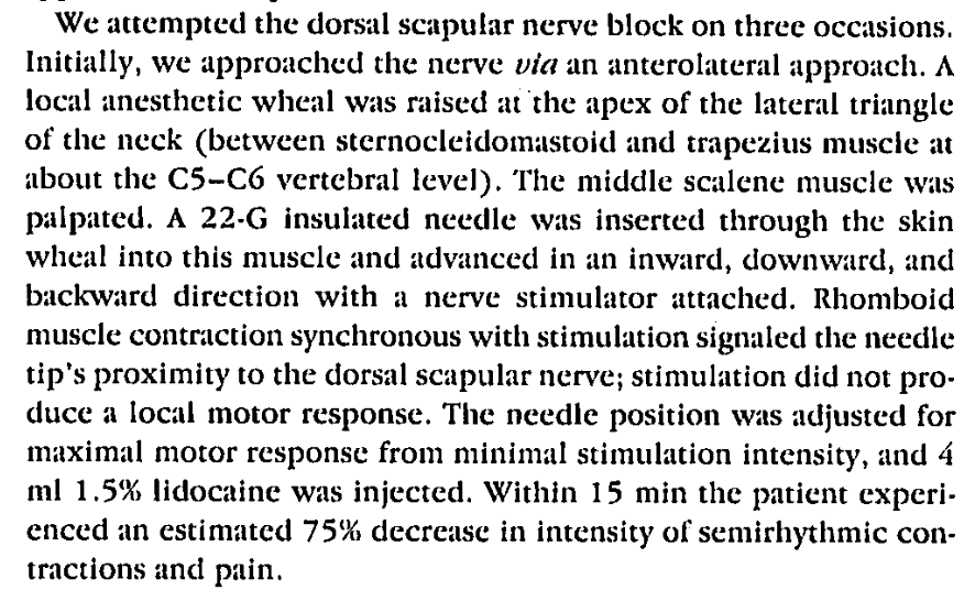Haim, K., & Urban, B. J. (1993). Dorsal scapular nerve block: description of technique and report of a case. Anesthesiology (Philadelphia), 78(2), 361-363.