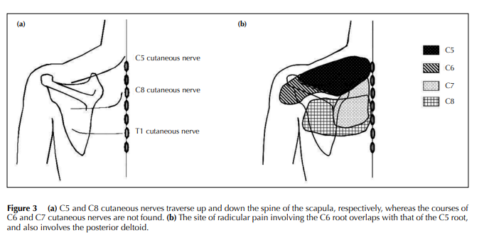 Mizutamari, M., Sei, A., Tokiyoshi, A., Fujimoto, T., Taniwaki, T., Togami, W., & Mizuta, H. (2010). Corresponding scapular pain with the nerve root involved in cervical radiculopathy. Journal of Orthopaedic Surgery, 18(3), 356-360.
