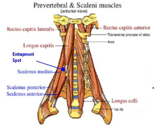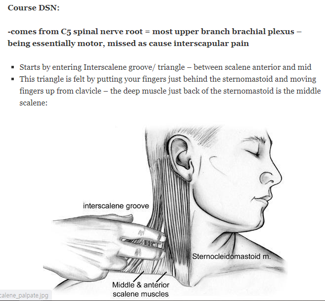 - Anteriorly, this would be felt at C5 where it enters the mid scalene (felt as muscle in triangle just behind sternomastoid). They thought less than 1/2 of pure DSN sydrome cases were tender there.