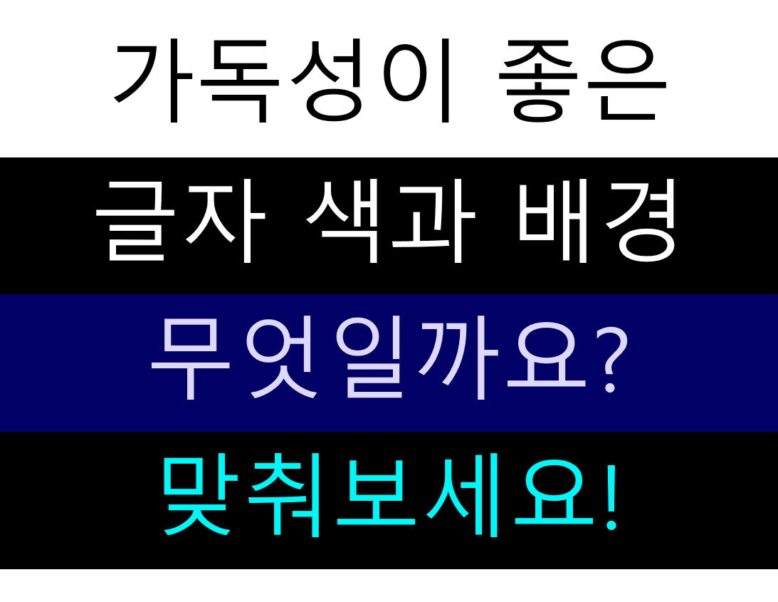 두구 두구 정답은: "검은색 텍스트에 흰색 배경"이었습니다. 1번인데 맞추셨나요? 모두 쉽게 맞추셨을 것 같은데요, 이 조합이 텍스트와 배경 사이의 가장 큰 대비를 가지고 있었기 때문에 즉, 밝기 또는 어두움이 크게 달라서 가독성이 좋고 독자의 이해를 높인다고 설명합니다. 그다음으로 높은 옵션은 흰색 글자에 검정색 배경이었습니다. 가장 최악의 가독성을 보였던 것은 4번째 옵션이었습니다.
