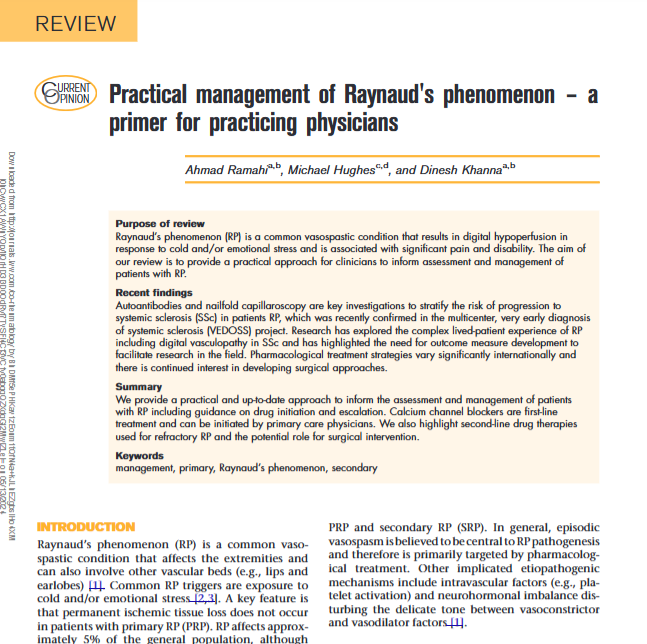 Ramahi, A., Hughes, M., & Khanna, D. (2022). Practical management of Raynaud's phenomenon–a primer for practicing physicians. Current opinion in rheumatology, 34(4), 235-244.