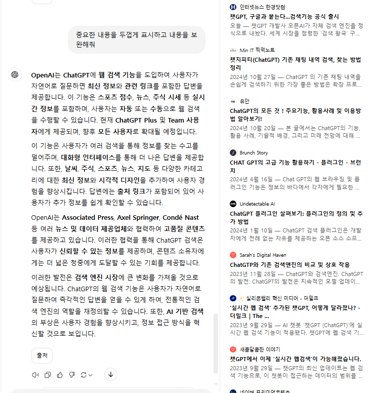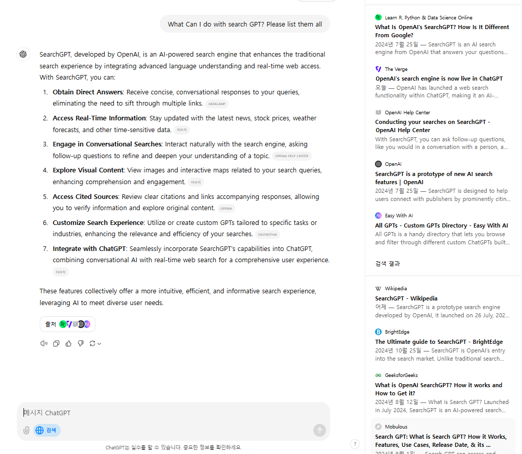 1. OpenAI가 ChatGPT의 검색 기능인 '서치 GPT'를 출시했습니다. 이전에는 정확한 출처를 확인할 수 없어 불편했지만, 서치 GPT는 정보의 출처까지 명확히 제공합니다.
