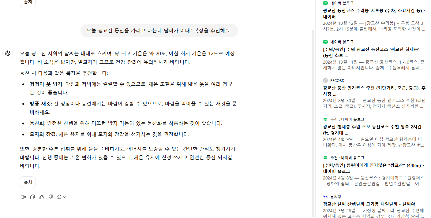 3. 나의 말을 이해하기에 자유로운 응용이 가능합니다. 서울 날씨나 특정 산의 등산 복장 추천도 잘해주고, 논문이나 보고서도 검색해 주지요..! 예를 들어, 한강 작가의 노벨문학상 수상 의의와 같은 질문에 즉각적인 요약문을 제공하고 프롬프트로 요청을 잘하면 더 긴 글로 바꾸어주고 공신력 있는 출처를 찾아 주기도 합니다.