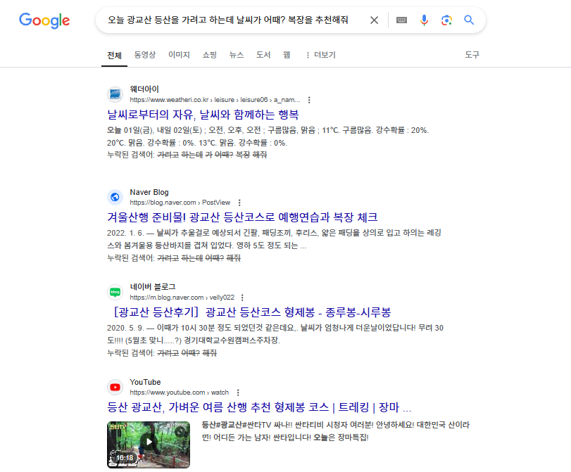 이번에도 난리 납니다.. 초급자 중급자 나누어 보여주고 일교차 등 날씨를 고려까지 해주네요. 등산을 좋아하시는 아버지를 위해 등산을 예시로 들어봤습니다. 그럼 조금 더 실무적인 것을 해볼까요?