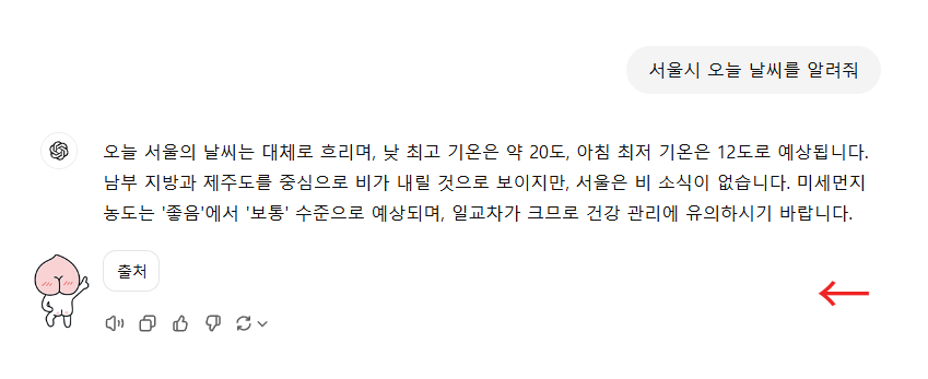 여기서 "출처"를 눌러보세요. 날씨 정보를 어디서 가져왔는지 알려줍니다.