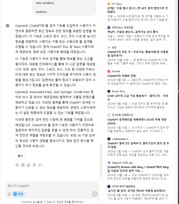 2024/10/31 오늘은 새로운 검색 시대를 맞이하는 날이 될까요? ChatGPT에서 인터넷 검색이 가능한 서치 지피티를 출시했습니다.