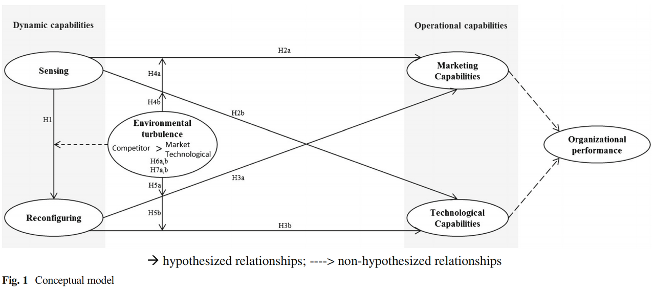 - Dynamic Capabilities [Sensing → Reconfiguring] → (Environmental Turbulence) → Operational Capabilities [Marketing & Technological Capabilities) → Organizational Performance