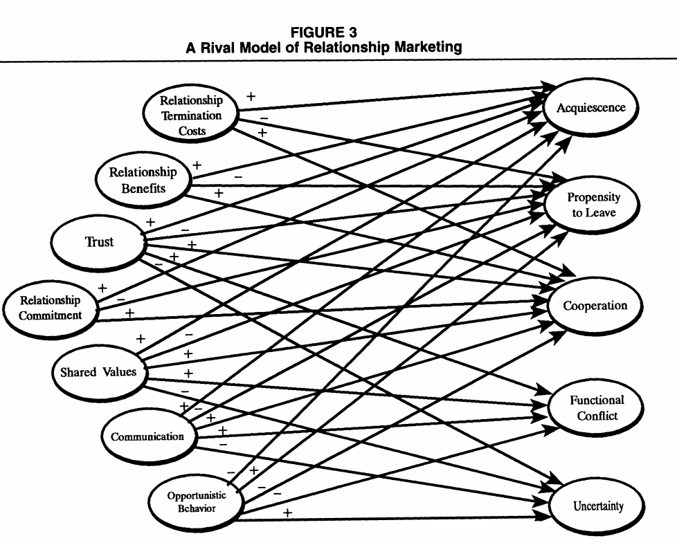 • relationship termination costs, relationship benefits, shared values, communication, and opportunistic behavior