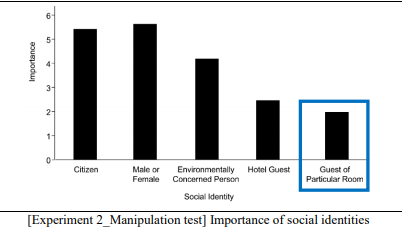 The location and method of the experiment were the same as experiment 1, but five different towel reuse messages were used. (1) The standard message (2) The guest identity descriptive norm (3) The same room identity descriptive norm (4) The citizen identity descriptive norm (5) The gender identity descriptive norm