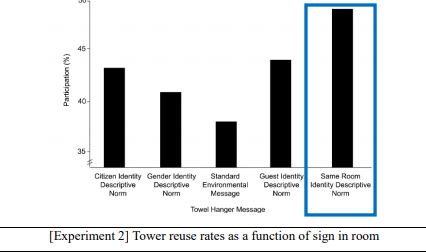 Q. 어떠한 문구로 호소해야 사람들이 호텔에서 수건을 재활용하게 만들 수 있을까요? 수건을 재활용 해주세요! NOPE 대부분의 손님들이 수건을 재활용 했습니다 (descriptive norm)! Not Bad 이 방을 거쳐간 대부분의 손님들이 수건을 재활용 했습니다 (Provincial Norms)! GREAT!