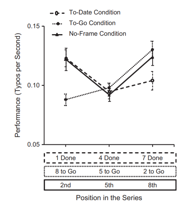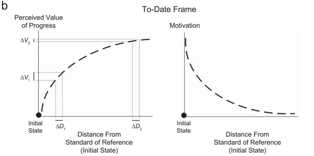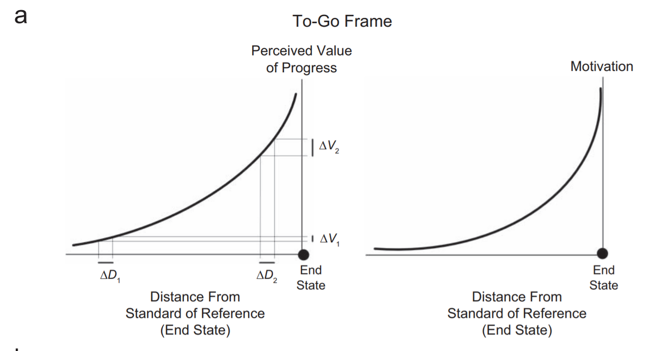 On the other hand, the motivation can be lower when they are the halfway point on the way to the goal. Because people use attentional shift from the starting point to the end point for pursuit their goal. The authors propose a psychophysical explanation “Stuck in the middle” with a U pattern in relation with the perceived marginal value of progress toward the goal.