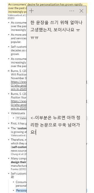 그리고 각 문장을 쓸 때 고민했던 다양한 문장들이나 출처, 혹은 아까 정리한 논문으로 이어지는 링크는 또 각 문장 아래 쭉 정리되어 있습니다.