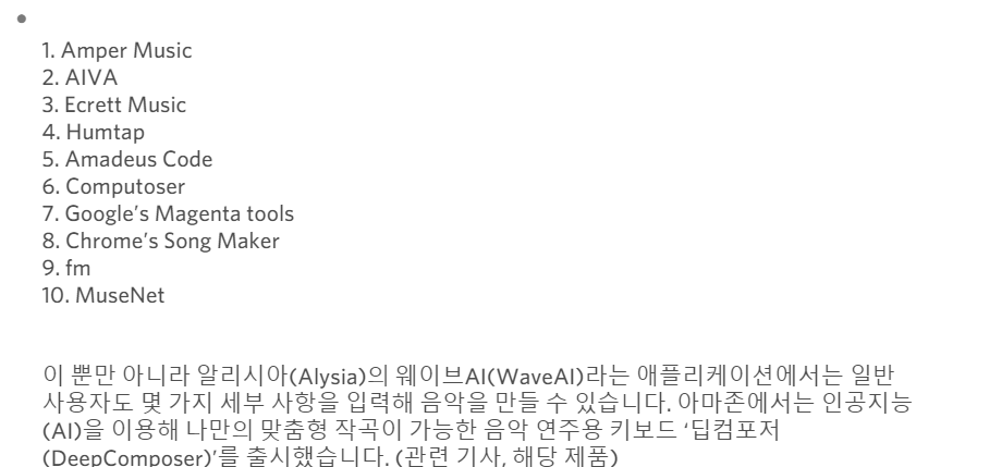 또 가끔 링크가 딸려 있는 글을 복붙 할 때 링크는 안붙여넣어졌으면 좋겠을 때가 있죠? 예를 들어서 제가 인공지능 작곡가에 대하여 소개한 글인데 글이 링크가 많거든요. 그런 글을 복붙할때 혹은 논문 글을 복붙할 때 (reference가 대부분 링크여서) 애를 먹으실거에요.