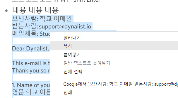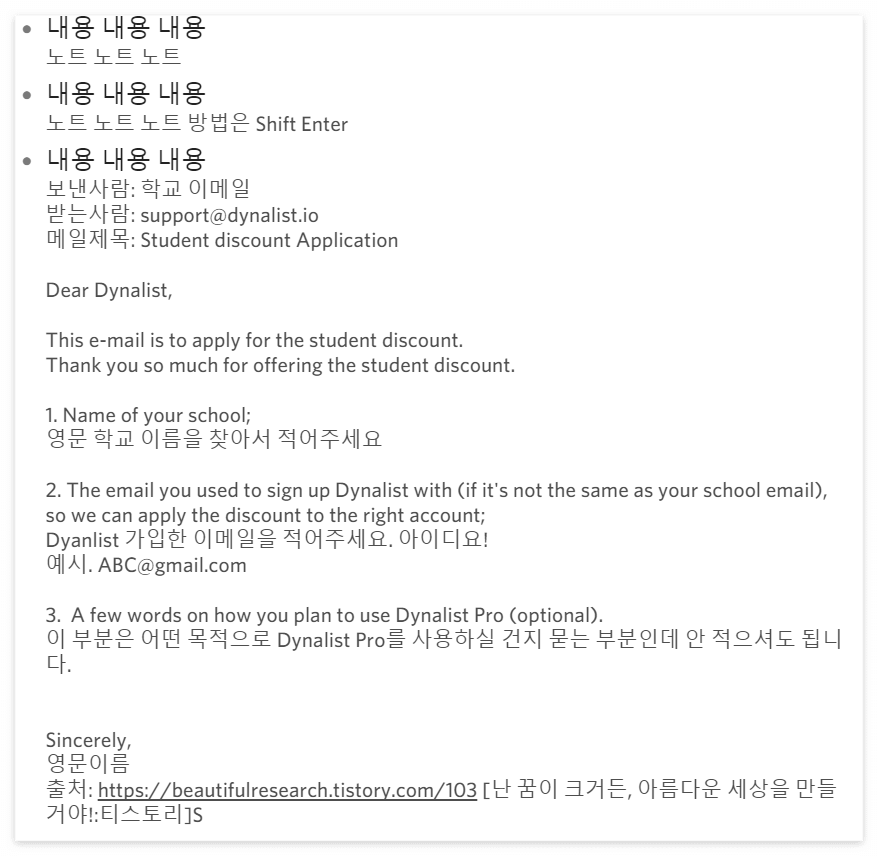 Dynalist 학생 할인 이메일 샘플 & 한달 무료 사용 (다이널리스트, 다이날리스트)