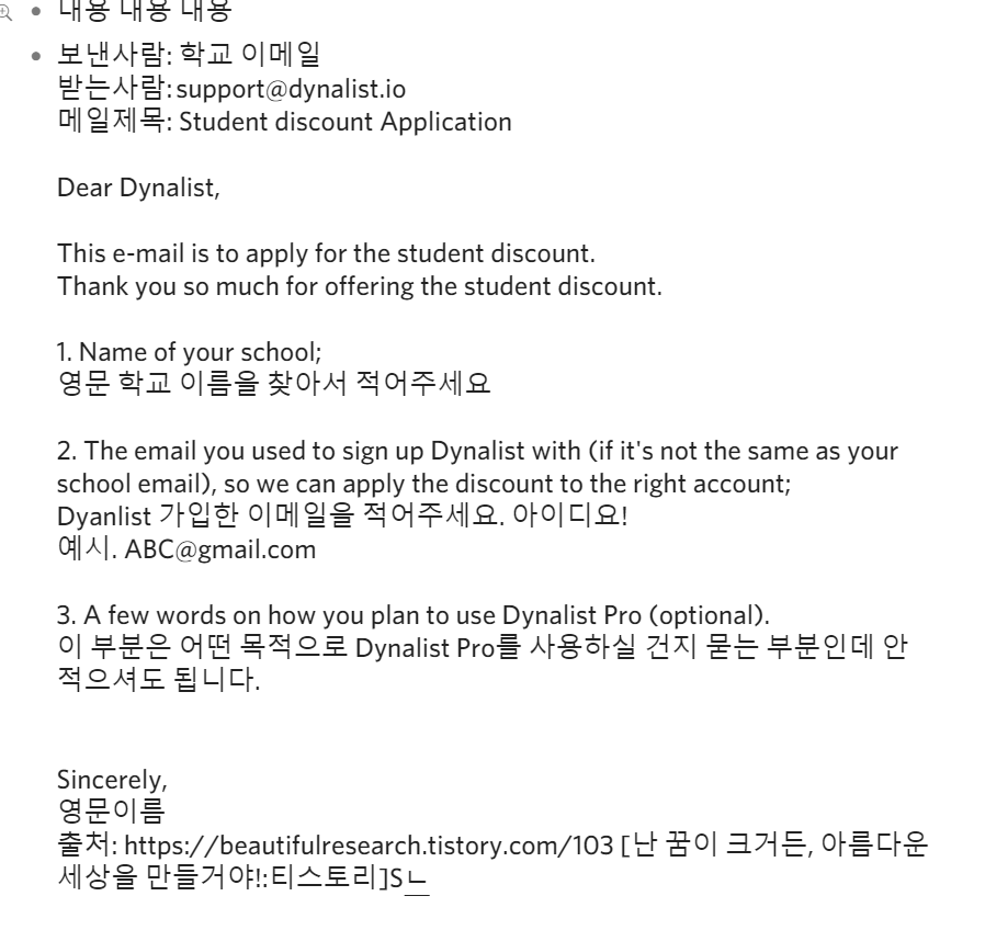 Dynalist 학생 할인 이메일 샘플 & 한 달 무료 사용 (다이널리스트, 다이날리스트)