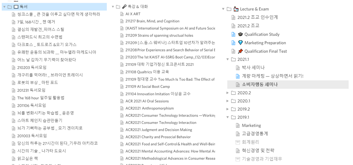 저는 이렇게 아래 보이듯이 제가 들은 강의, 읽은 책, 수업 내용 등 다 여기에 정리해요. 검색이 용이하기에 그때 그 내용 뭐였더라? 검색하고 싶을 때 정말 용이하고, 강의자료 만들고 전자책 쓰고 할 때 정말 좋더라고요!