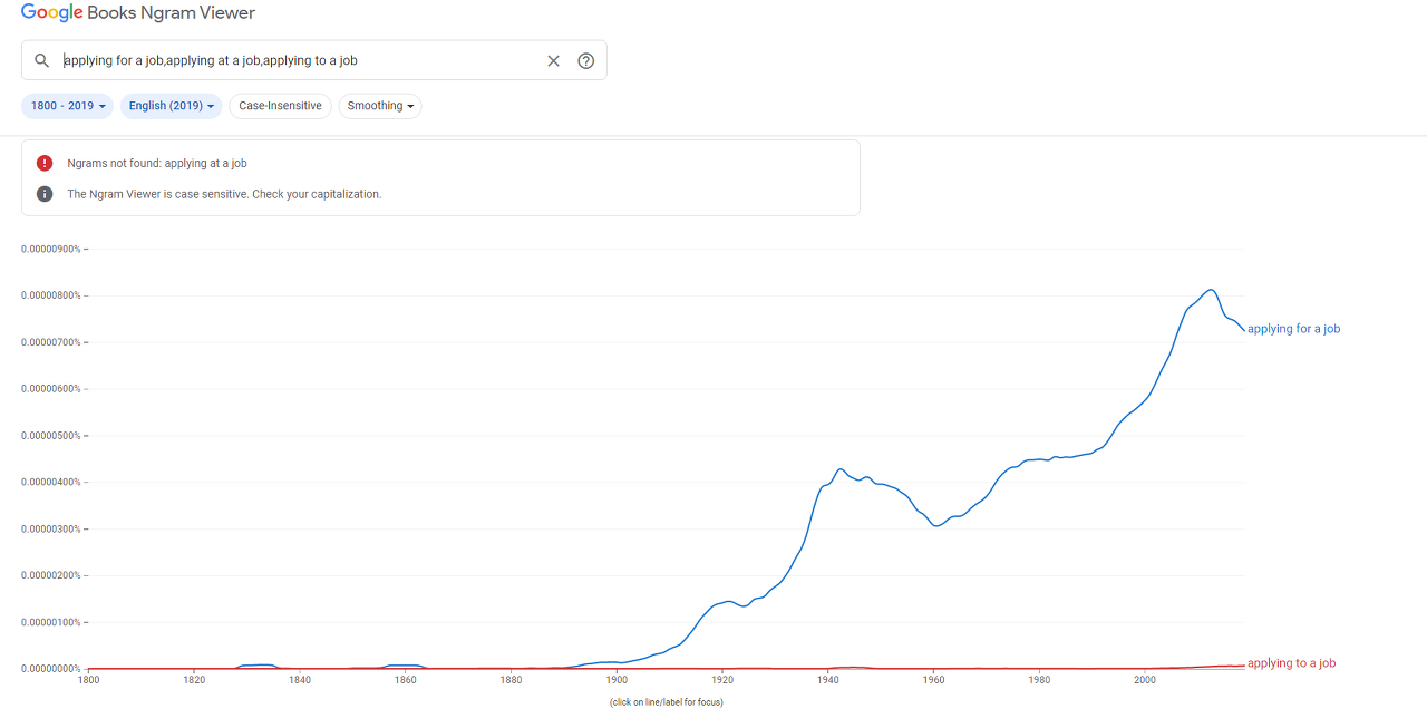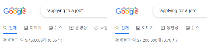 핵심은 구글 검색 기능을 이용하라는 거예요! 예를 들어서 "applying [빈칸] a job" 빈칸에 들어갈 전치사가 헷갈리신다면?