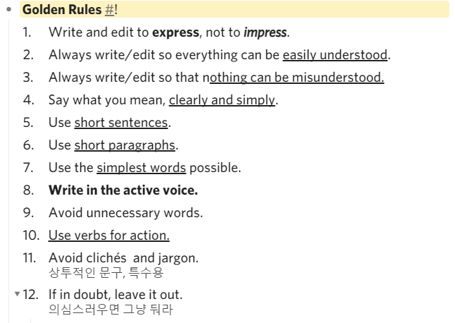 제가 정리한 황금 법칙인데, 저는 글 쓰기 전에 황금 법칙들을 한 번씩 읽고, 최종 교정할 때도 한번씩 다시 훑고 있습니다. 기회가 된다면 정리한 내용도 올려 드릴게요! 아 참고로 이 책은 영어 버전만 있는 것 같습니다. 관련 책자 필요하시면..아래에 톡남겨주세요! (문제가 되면 이 부분은 지우겠습니다) https://open.kakao.com/o/snsZtSad