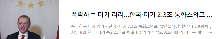 그 와중에 터키와 통화 스와프한 우리나라.... 외교적인 투자라고 생각하며 위로를 해야 할 것 같네요..! 터키도 우리나라의 IMF때 통화 스와프를 해줬다고 해요.