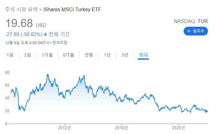 입수한 정보는, 요즘 은행해서 리라화 취급을 잘 안하려고 한다네요! 따라서 간접적으로 미국 나스닥에 상장되어 있는 터키 기업 ETF에 투자해보는 것이 가장 손쉬운 방법인 것 같습니다. 저도 우선 간도 볼겸 120만원 정도 들어갔습니다.