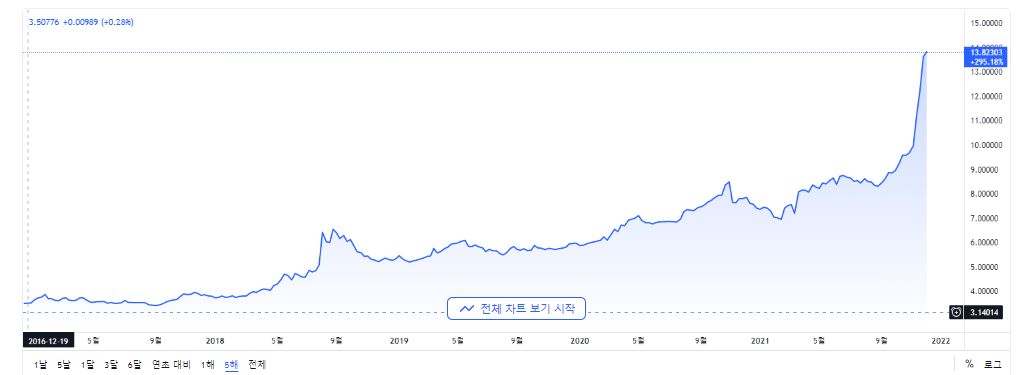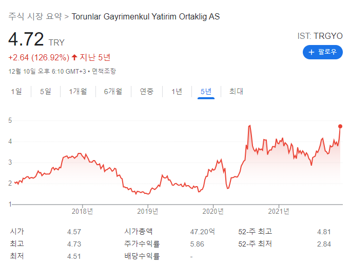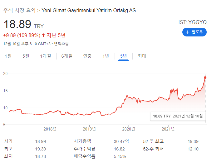 다음 소개할 기업은 Yeni Gimat REIT으로 8. 92%의 점유를 하고 있다. 이 친구도 많이 오르긴 했지만.. 리라화 가치를 생각하면 읍..읍..
