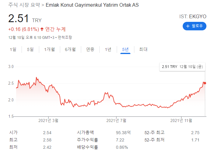 먼저 터키 최대이자, 국유 리츠 기업인 Emlak Konut를 보겠다. 시장 점유율이 19,46% 라고 한다. 주당 2.51리라이지만, 리라화 가격이 10배 폭락한걸 생각하면 실질적으로는 많이 떨어졌다고 볼 수 있을 것 같다.