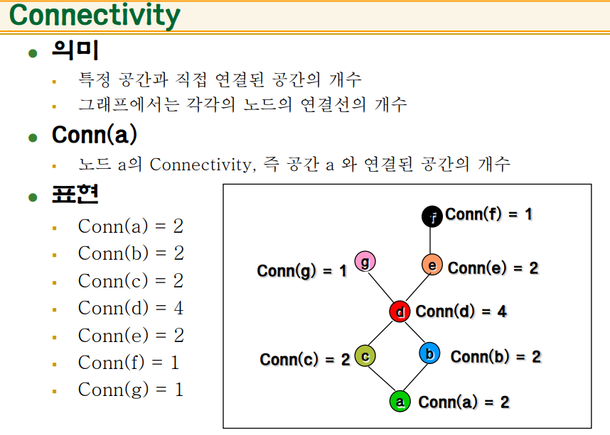임의의 공간에 얼마나 많은 공간이 연결되어 있는지를 나타내는 인자로 한 공간에 인접한 공간과의 통제 정도를 국부적으로 측정하는데 사용된다. 연결도는 축선이나 볼록 공간과의 연결수치로 연결도가 높다는 것은 다른 공간과의 연결이 용이 하다는 것을 의미한다.