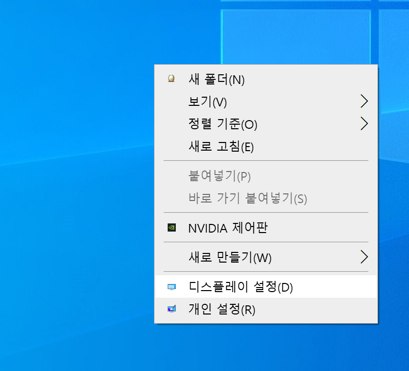 1. 바탕화면 우클릭, 디스플레이 설정을 누르시고