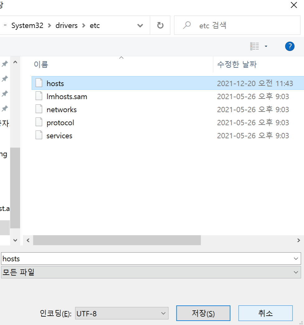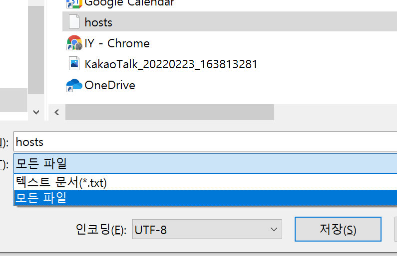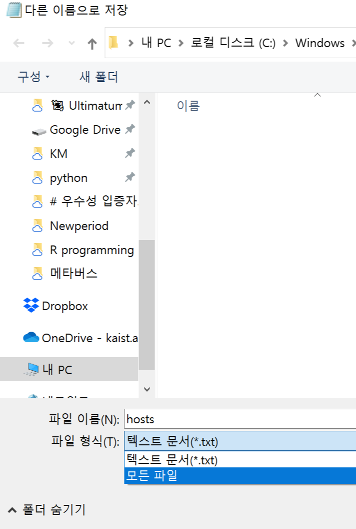 3. 다른 이름으로 저장을 누르고, hosts가 있던 폴더에서 모든 파일을 누른다.