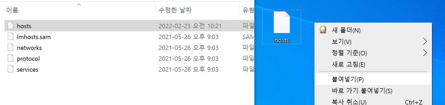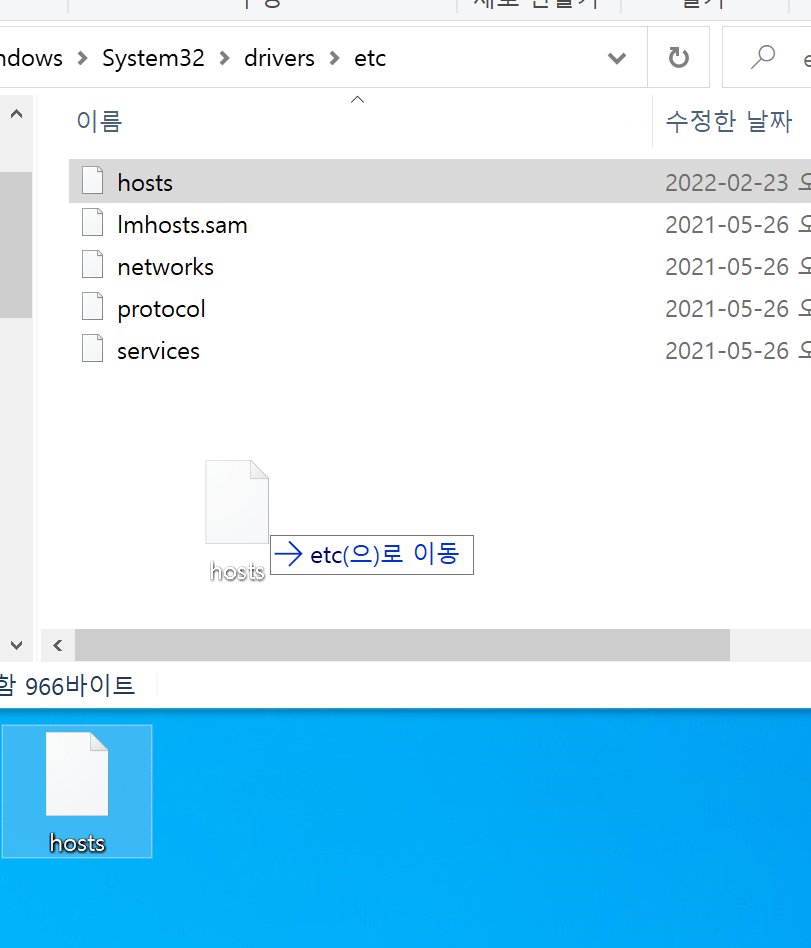 1. 폴더 안에 있는 hosts 파일을 바탕화면에 복사 붙여 넣기 한다.