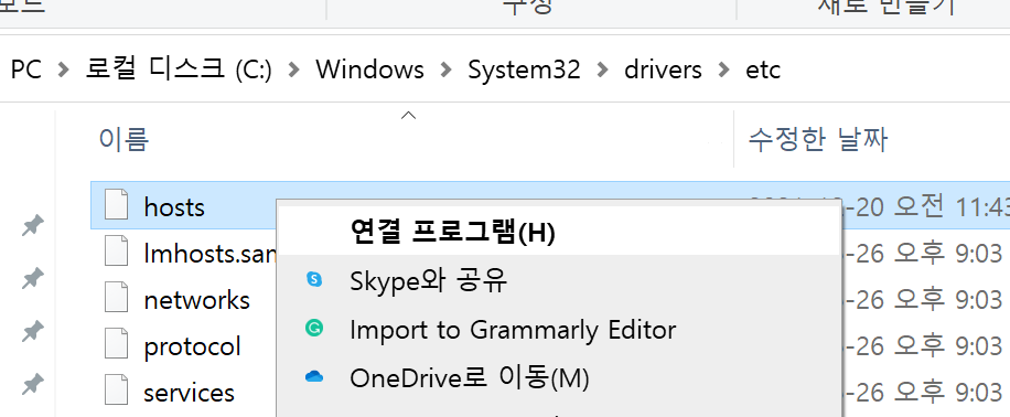 1. C:\Windows\System32\drivers\etc 에 들어가면 hosts라는 파일이 있다. 해당 파일을 메모장으로 열자.